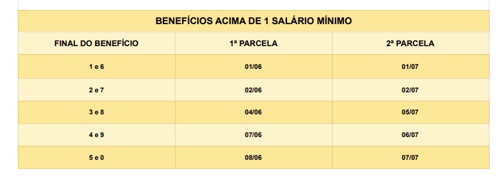 Para aqueles que recebem um salário mínimo, o depósito da antecipação será feito entre os dias 25 de maio e 8 de junho, de acordo com o número final do benefício, sem levar em conta o dígito verificador. Segurados com renda mensal acima do piso nacional terão os pagamentos creditados entre 1º e 8 de maio.