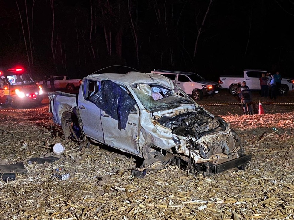 A caminhonete saiu da pista, capotou e foi parar em uma lavoura às margens da rodovia