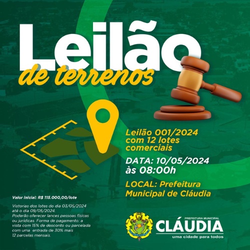 Prefeitura de Cláudia fará leilão de 12 lotes nesta sexta-feira