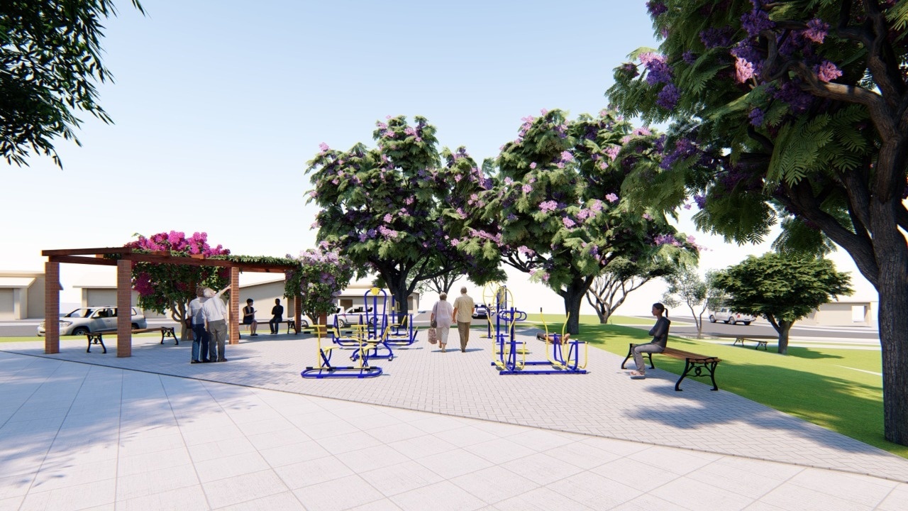 As obras da Praça dos Migrantes já iniciaram. Será construído piso, playground, área de alimentação, meia quadra de basquete, arquibancadas, expansão do palco, plantio de grama, árvores ornamentais e palmeiras.